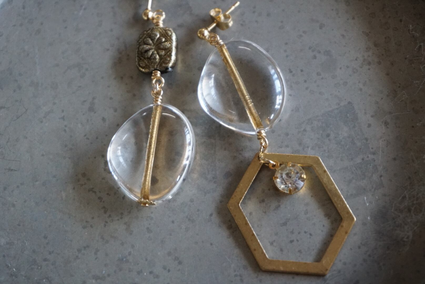 中心がゴールドのクリアビーズにアンティークっぽいパーツに真鍮に合わせました♡