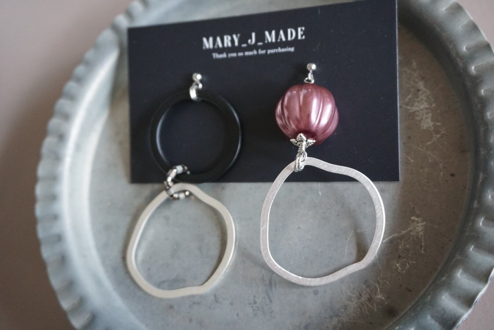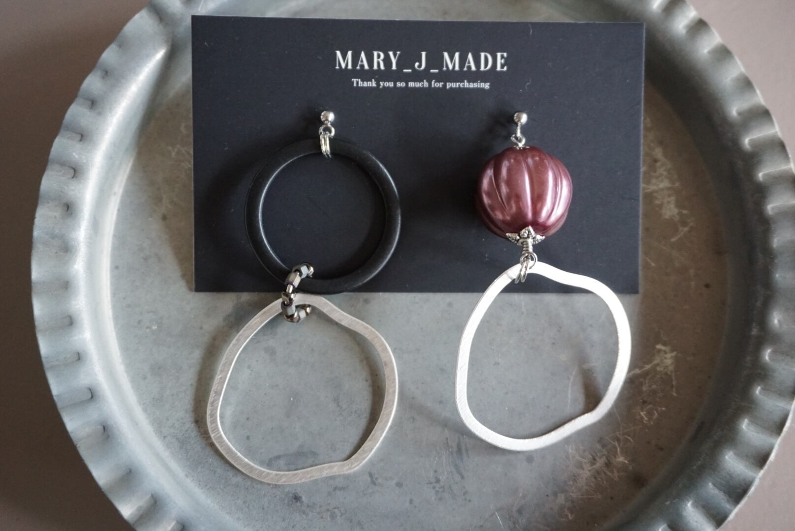 マットなシルバーのリングに大きなビーズを合わせたアシメの作品です。
