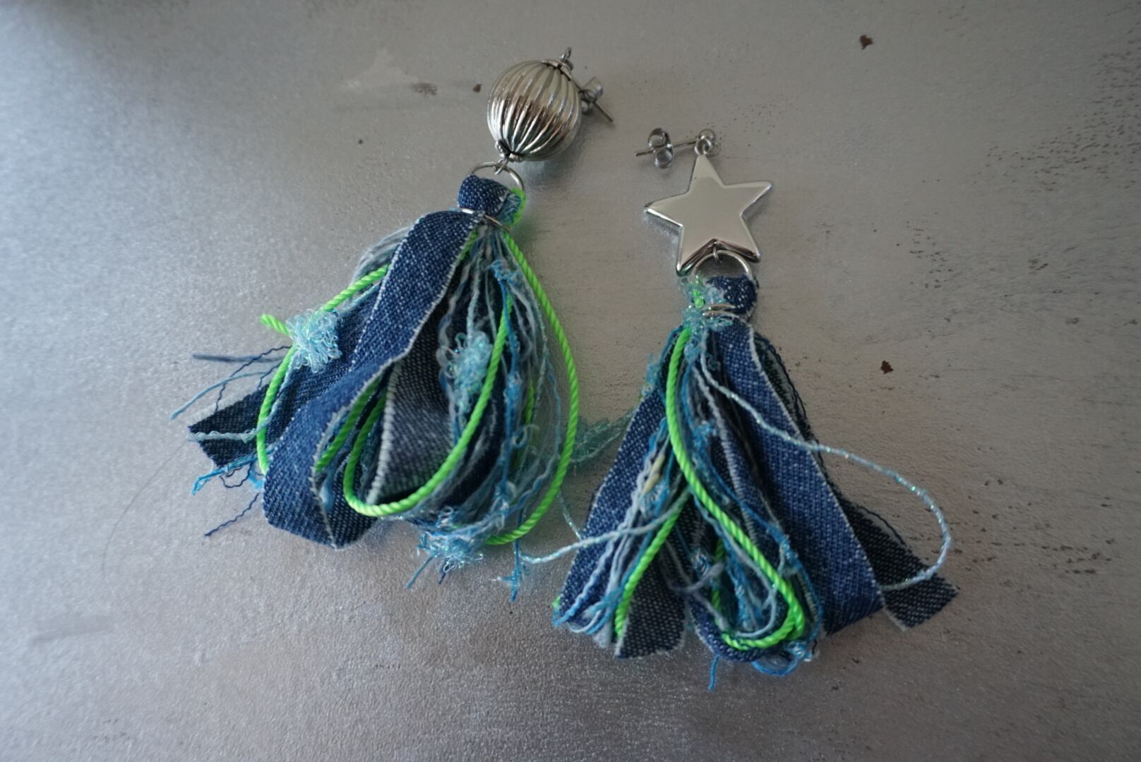 デニムとネオンカラーのコードを使ったピアスです!!